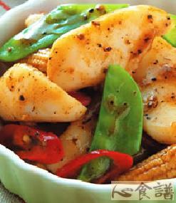 花枝片300公克,碗豆荚40公克,玉米笋40公克,红萝卜片40公,洋葱丝30公克,蒜末30公克,辣椒片20公克,沙拉油2大匙,黑胡椒酱120cc,梅林辣椒酱1大匙,水60cc