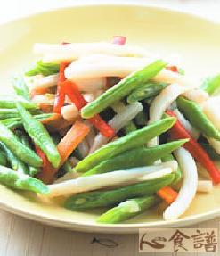 花枝150公克,四季豆50公克,姜10公克,红甜椒5公克,水30㏄,糖1/2小匙,鲜美露1大匙