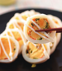 4.将作法3的中卷放入煮沸的蒸锅中,蒸约15分钟取出待冷,切片状摆盘,挤上美乃滋即可。