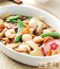 a.海参1条,虾仁5颗,水发鱿鱼100公克,鸽蛋3粒,脆笋片20公克,甜豆5条,红萝卜片20公克,鱼板4片,b.蒜末1/2茶匙,鸡汤80㏄,a.盐1/2茶匙,蚝油1大匙,胡椒粉1/4茶匙,香油1/2茶匙,b.太白粉水1大匙,绍兴酒1茶匙