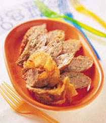 5、锅中倒入刚才调好的番茄味汁,烧开后投入炸过的肉卷,焖煮至汁液收干,取出切成小块。