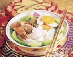 (2)将高汤倒入锅中加热,依序放入所有材料及调味料煮沸至全熟,再盛入汤碗内即可。