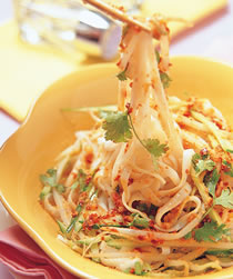 板条300g,小黄瓜1/2条,花生粉1茶匙,香菜适量,云南凉面酱3大匙