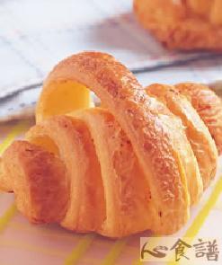高筋面粉398公克,低筋面粉171公克,速溶酵母15公克,细砂糖46公克,盐9公克,冰水273㏄,奶粉23公克,全蛋57公克,奶油28公克,裹入油263公克,装饰:少许