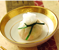 (4)将揉好的面糰分成12等份,再用桿面棍桿成圆片状,放入1份馅料后收口,包口处需提高。用1条韭菜将包口绕圈,并打上蝴蝶结,依序完成12份备用。