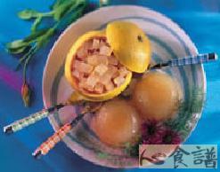 (3)等温度略降后,将葡萄柚冻液,倒入葡萄柚壳内至满,剩下再倒入其他容器内(以容易取出为佳)。