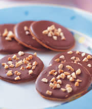 6.巧克力切成小块,以隔水加热的方式融化后,淋在烤好的饼干上,并撒上作法1的杏仁角即完成。