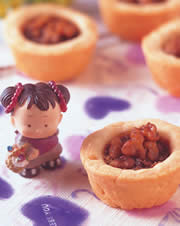 5.将简易塔皮放入烤箱上层,以180℃约烤20分钟后取出,用小汤匙将作法2的杯塔馅料慢慢舀入塔皮内,再一起放入烤箱中层,以180℃约烤20分钟后脱模即可。