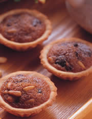 a.松子60公克,细砂糖50公克,红糖30公克,盐1公克,温水150公克,桂圆80公克,葡萄干70公克,无盐奶油40公克,中筋面粉70公克,发粉1公克,小苏打粉1公克,蛋50公克,b.基本塔皮300公克