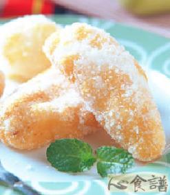 4.将作法3整形好的小面糰放入180℃的热油中炸至金黄色,起锅沥干油后立即在表面沾上砂糖即可。