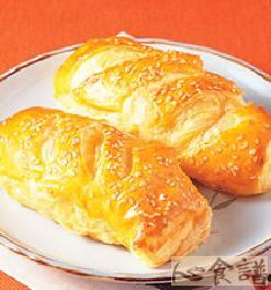 3.将酥皮面皮刷上一层全蛋液后,再取适量的蔬菜馅料放置在面皮中央处,并将面皮两边向内捲起翻面,刷上一层蛋黄液后再撒上白芝麻。