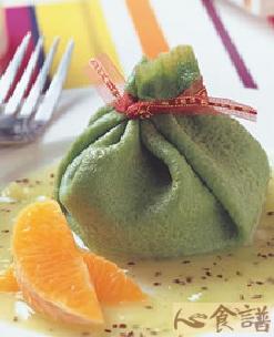 1.取一片抹茶口味饼皮,将巴巴露放在饼皮中间,包裹起来,打个蝴蝶结即可。