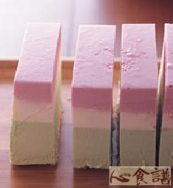 红色慕斯:15公克,覆盆子泥117公克,细砂糖64公克,鲜奶油250公克,白兰地20公克,白色慕斯:117公克,细砂糖64公克,吉利丁15公克,鲜奶油250公克,白兰地20公克,绿色慕斯:6公克,沸水117公克,细砂糖64公克,吉利丁15公克,鲜奶油250公克,白兰地20公克