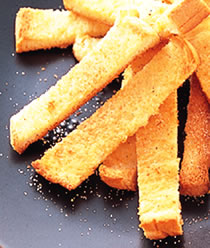 2.将奶油均匀的涂抹在作法1的土司片上,再将土司片切成宽约1.5公分的长条状后,放入烤箱中以各200℃的上下火续烤约4分钟至土司外观呈金黄酥脆后取出。