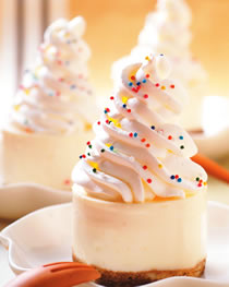 4.低脂鲜奶油以球状拌打器打发并打至变硬后,装入挤花袋内,以如霜淇淋的花纹挤在作法3的表面,再撒上些少许彩色巧克力即完成。