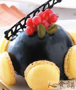 材料1:250公克,糖粉100公克,柠檬果汁粉5公克,蛋白100公克,细砂糖50公克,黄色色膏少许,材料2:适量,布朗尼小圆球蛋糕2个,苦甜巧克力砖100公克,动物性鲜奶油100㏄,醋栗适量