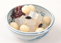 寒天,糖渍黑豆少许,红豆泥1匙,黑糖蜜,白玉