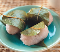 5.手上沾抹冷开水,将作法4完成的面糰均分成8等份,每一份搓圆后压扁,包入作法1的红豆泥,用手塑成椭圆形,放在樱花叶的一端上,另一端盖在麻糬上即可,吃的时候可连樱花叶一起食用。