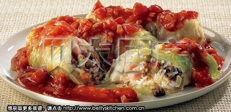 (四人份),大白菜叶16片,橄榄油2汤匙(30ml),切细的洋葱1只,压碎的大蒜2瓣,牛肉馅250g,切条的西式火腿150g,大米1/2碗(125g),芹菜末2汤匙(30g),酸豆角末2汤匙(30g),香醋1汤匙(15ml),红糖1汤匙(15g),辣椒粉1茶匙(5g),盐2茶匙(10g),水1/2碗(125ml),盖浇汁用料:橄榄油1汤匙(15ml),切细的红皮小洋葱1只,罐装切块番茄1罐(约425g),番茄酱3汤匙(45ml),白葡萄酒1/2碗(125ml),白砂糖1茶匙(5g),盐1茶匙(5g),切小块的黄油30g