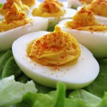 3.小心用勺把蛋黄混合物放回蛋黄原来的位置,但不要用勺压,使混合物稍微有些突出。应该有足够的料填满所有蛋白上的凹。把辣椒粉撒在蛋黄上。把鸡蛋放在铺有生菜叶的盘子上,用香菜装点。待鸡蛋完全冷却后食用。