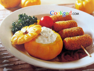 (6)将蛋黄酱放入小南瓜内,即可与炸鸡茸丸一同享用。