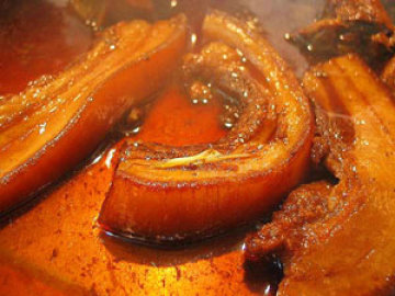 1、将五花肉切成5-10厘米厚的扇面,浸入老抽和白糖,腌制一夜。
