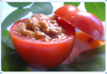 3.焖肉的时间,取一个番茄,从三分之一处横切一刀,用小勺把茄肉挖出来,用小碗装好,这时番茄变成一个番茄盅了,我打算要把它当成一个盛器用,可以直接使用,也可以放进微波炉里稍稍叮几秒钟后再使用,我喜欢生食番茄,所以没加热。10分钟后开大火,倒入挖出来的茄肉,大火收汁,浓香汁多,酸甜微辣的茄肉梅香肉出锅啦,小心放入番茄盅内,完成。