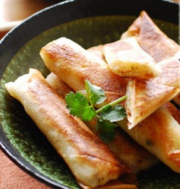 4.然后把用春卷皮把馅料包好成春卷,然后在锅里煎到两面金黄后捞出后吸去表面油份就可以了