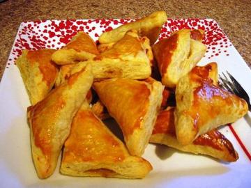 2..烤箱375f预热(puff pastry说明书上要求400f),puff pastry放在室温30分钟左右解冻.铺在干净平整的地方,切大约3x3英寸大小.放入少量鸡肉咖喱陷,对角合起来,放在烤盘上,扫一层蛋黄液.