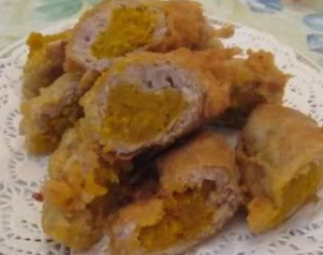 3.轻轻快速把肉卷放入内,炸至表面金黄色即可捞起。