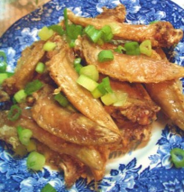 翅尖用少许盐和白胡椒面、料酒和淀粉腌几小时,再放入锅炸至金黄色,面上撒少少葱花儿。