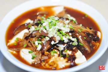 6:炒锅烧热放油 放入香菇 黑木耳 黄花菜翻炒 放老抽翻炒加水煮10分钟 放盐 糖 倒入蛋液生粉勾芡浇在豆腐上 撒上蒜末 香葱即可