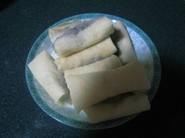 4 包好的豆沙春卷。(可以多包些,冻在冰箱里,随吃随取)