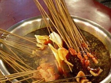 3、烫制。卤水锅置旺火上,使之保持小沸,将各类菜用串好的竹签烫制,根据不同菜肴的火候烫制成熟。