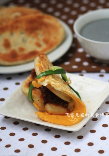 16.并在饼面上涂上喜欢吃的辣酱,蛋煎熟卷起即可
