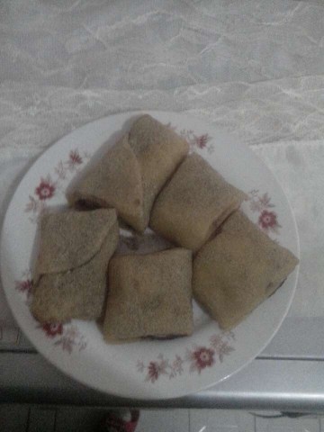 4.然后抹上赤豆沙馅(也可用红糖)卷起来,切成100克左右的小块,撒上白糖就成了。