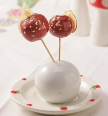 5、把迷你糖葫芦串放入糖浆蘸一下,然后迅速地把糖葫芦从糖中取出,放在板子上一摔再一拖下。趁着糖还没有降温,在糖葫芦表面撒一些芝麻,待糖凝固后即可。