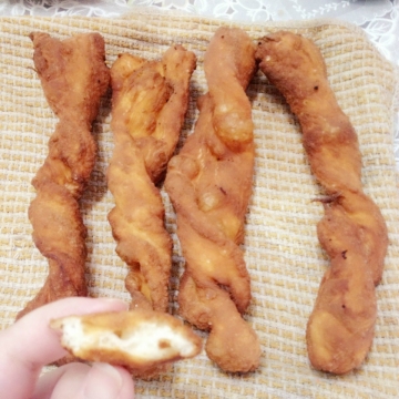 3、平底锅里多倒些油,烧滚后取一条面皮,拉长扭起来扔下去炸,一边炸一边用筷子翻滚,直到两面金黄就好了。