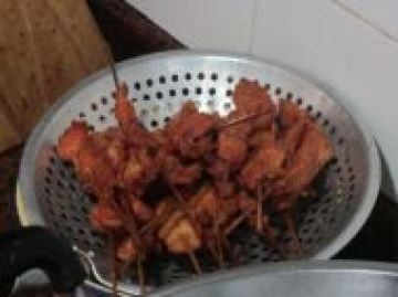 3.将鸡肉串放在油锅内,炸至两面金黄即可;