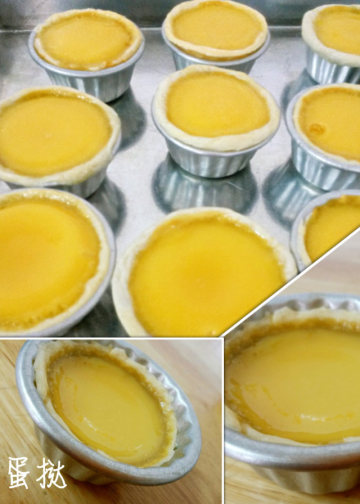 3、加入蛋挞浆,入180℃的烤炉中烘烤至熟,脱盏即成。