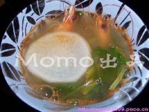 草虾12尾,萝卜120公克,姜片10公克,豆腐1块,干昆布15公克,水600cc,盐1/4茶匙,柴鱼粉1/2茶匙,味醂1大匙