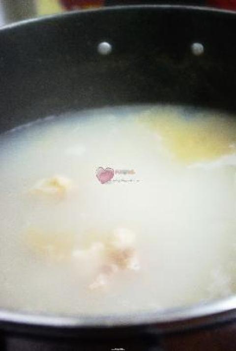 3.汤真的变白了。准备把浮油和黄色渣滓用勺子憋去就可以关火了,