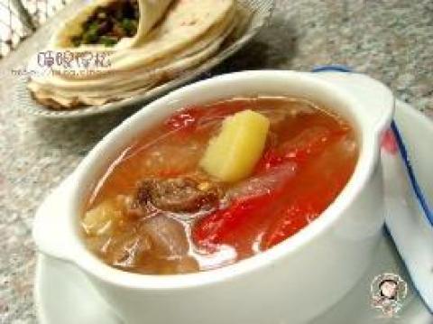 1.把洋葱,牛肉,西红柿,卷心菜(包菜)切丁。