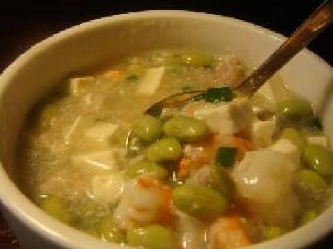 1.备锅下水,水滚后改小火依序放下瘦肉粒,豆腐粒,虾粒, 毛豆仁煮沸后,加点盐,胡椒粉调味.
