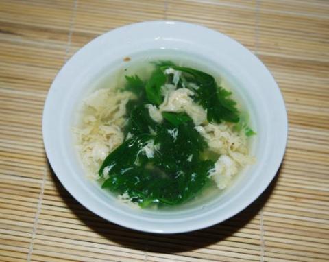 1.水烧开后放盐(这样叶子会更绿汤也不会发黑),翻滚后放入芹菜叶,开后鸡蛋边搅边淋入锅内。