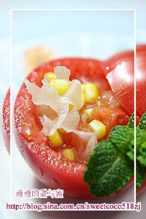 2.将番茄洗净去皮,切成小丁,与剥下来的甜玉米粒一起放进银耳汤中,小火煮15分钟后加盐即可。