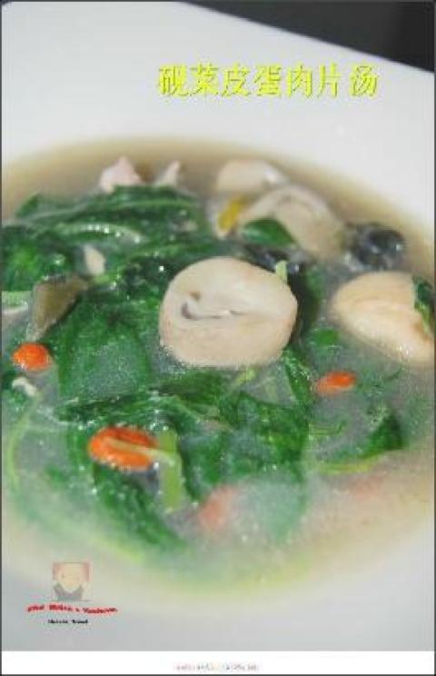 相关菜谱名称推荐:砚菜皮蛋肉片汤,砚菜皮蛋肉片汤,香菜皮蛋鱼片汤,芥菜咸蛋肉片汤