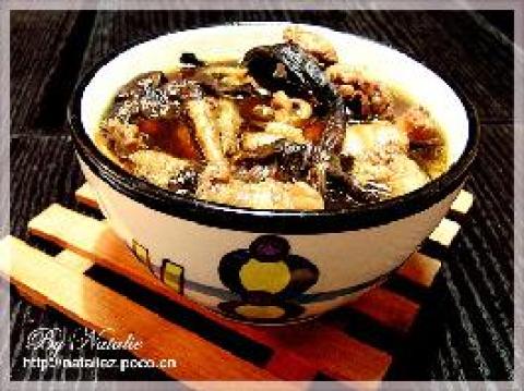 4.再次汤滚时,所有材料转入砂锅中,加适量食盐,转小火慢慢焖。