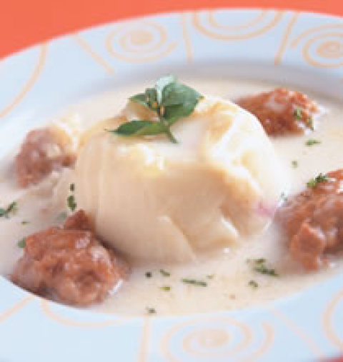 月桂叶1片,奶油30公克,洋葱丝50公克,芹菜珠2公克,低筋面粉14公克,猪高汤600㏄,鲜奶100㏄,茶碗蒸1/2个,熟猪肉丸80公克,盐少许,糖少许