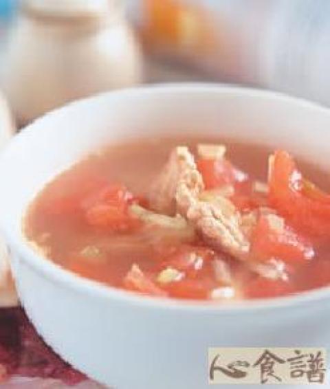 鱼高汤600㏄,蕃茄2个,芹菜珠10公克,猪肉片70公克,姜片2片,香油少许,盐少许,糖少许,酒少许,白胡椒粉少许